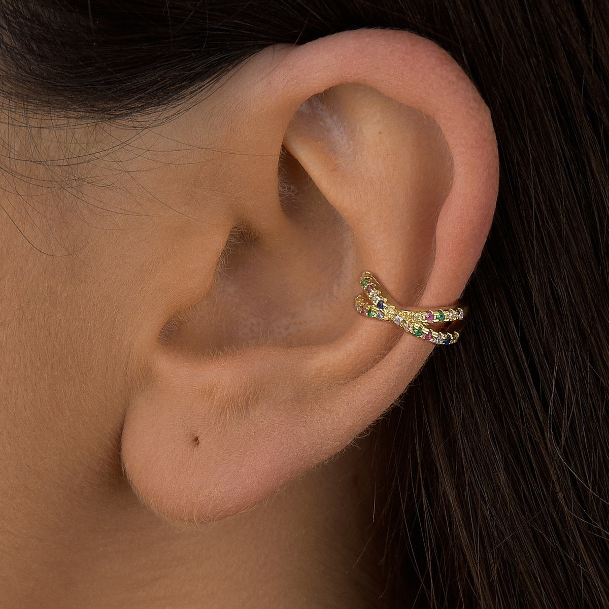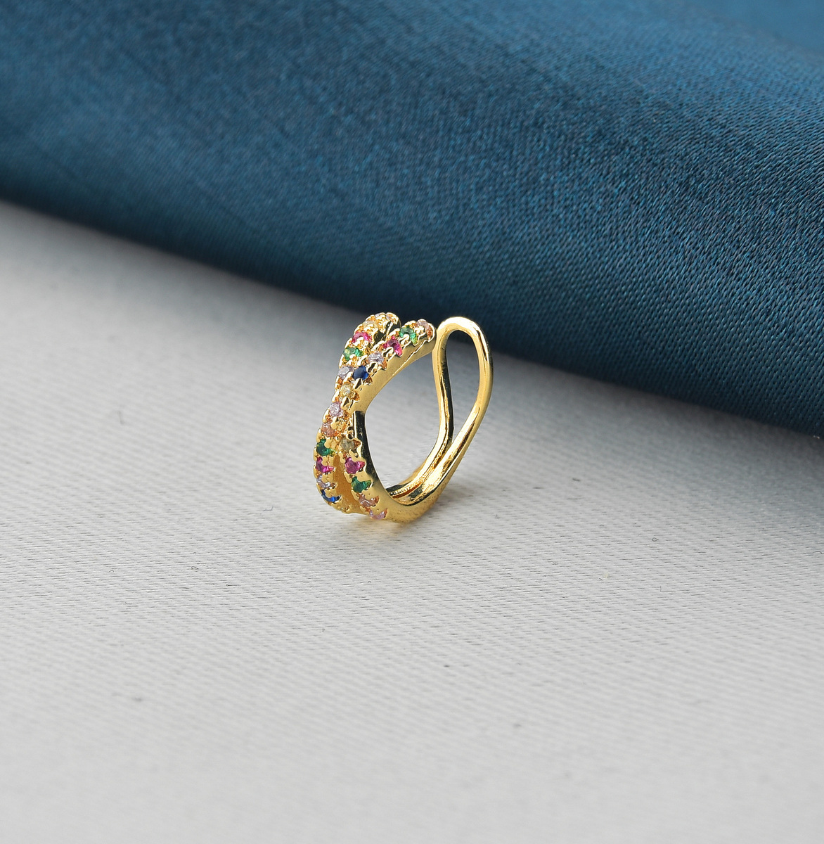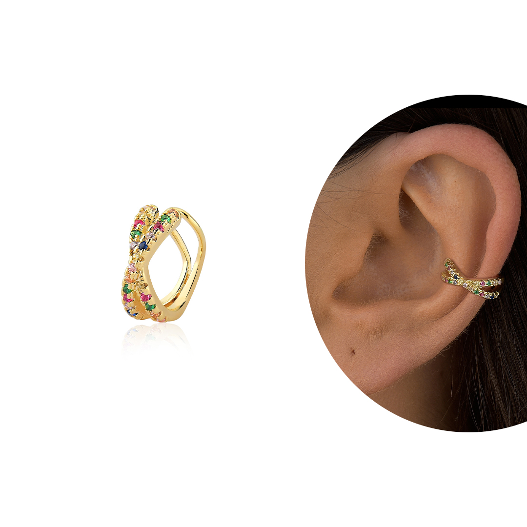 Piercing de pressão cravejado com micro zircônias coloridas – Banhado a ouro 18k
